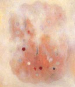 MAOシリーズはそれまでの装飾性をおびた絵画を一旦解体し、描き手自身の内面へと向かい始めました。ガンツフェルト(等質視野)と呼ばれる輪郭を持たない視野を彷佛とさせるような、心地よい浮遊感ただよう空間を創出します。絵を見る人の心のなかに未知のイメージが喚起されていくような、またゆっくりと気が増殖していくような、揺蕩う楕円形のイメ−ジは見る人自身が写し返されるような、鏡の絵画として目の前に立ち現れます。